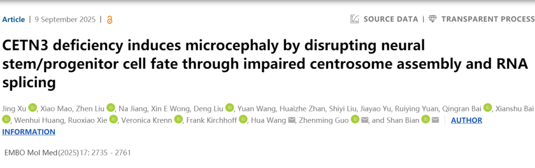 Recently, the research groups of Bian Shan and Guo Zhenming from the School of Life Sciences and Technology, Tongji University, Wang Hua from Hunan Children's Hospital, and Mao Xiao from Hunan Maternal and Child Health Hospital clinically identified a microcephaly patient carrying a CETN3 deletion mutation. The patient's head circumference was 2–3 standard deviations below the normal range. However, the regulatory function of CETN3 in human cerebral cortex development has remained unclear. Thus, the researchers collaborated to explore the function of this gene in cortical development (Soma Biosciences participated in the construction of CETN3 mutant iPSCs). The findings were published in EMBO Molecular Medicine.