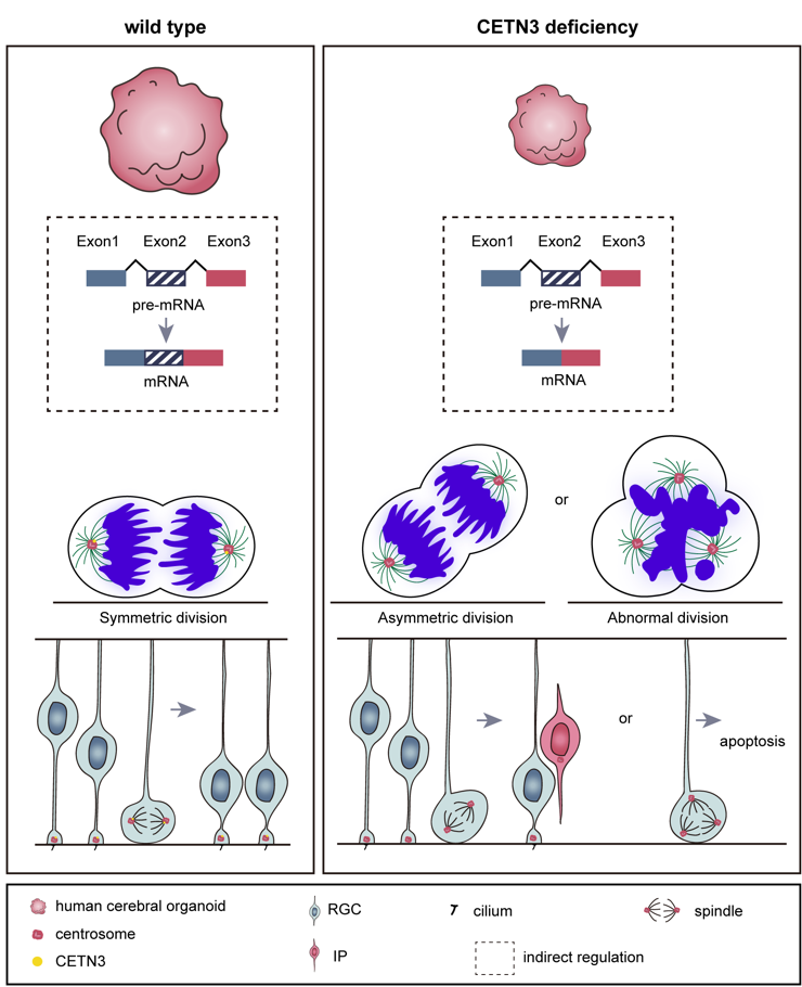 In summary, using cerebral organoids as the primary model, this study reveals for the first time the role of CETN3 in mammalian neural development and the underlying molecular mechanisms. The research demonstrates that CETN3 participates in regulating the balance between neural progenitor cell (NPC) proliferation and differentiation by modulating biological processes such as spindle orientation, cell cycle progression, and centrosome duplication. The study also reports for the first time that CETN3 is involved in RNA splicing in NPCs through its interaction with USP49, thereby indirectly influencing the cell cycle and neural development. These findings highlight the importance of CETN3 in the development of the human neocortex, expand our understanding of causative genes in primary microcephaly, and provide new insights for future clinical diagnosis and therapeutic strategies.